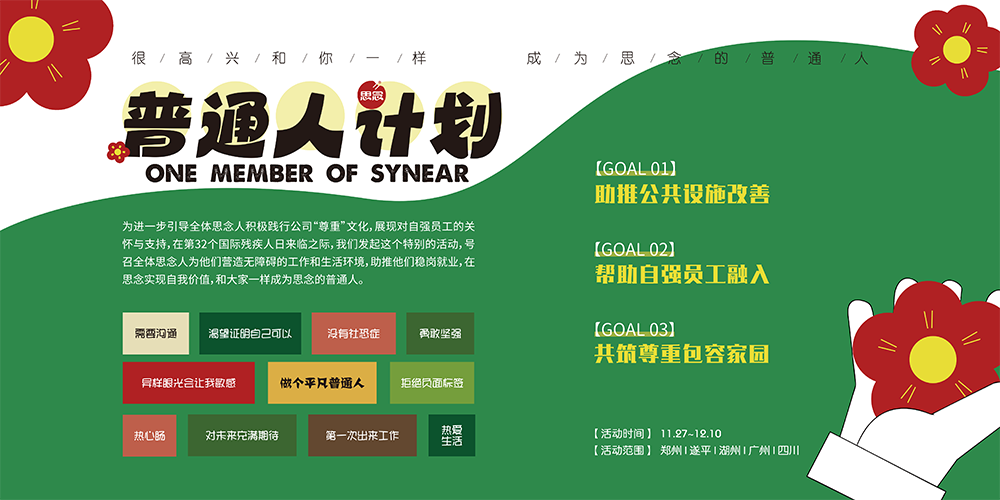 為進一步傳播針對自強員工的“尊重”文化,引導全體思念人積極踐行“尊重”文化,展現(xiàn)對自強員工的關懷與支持,在第32個國際殘疾人日來臨之際,思念食品組織開展了面向全國各生產基地的自強員工關愛活動,號召全體思念人為他們營造無障礙的工作和生活環(huán)境,助推他們穩(wěn)崗就業(yè),在思念實現(xiàn)自我價值,和大家一樣成為思念的普通人。
